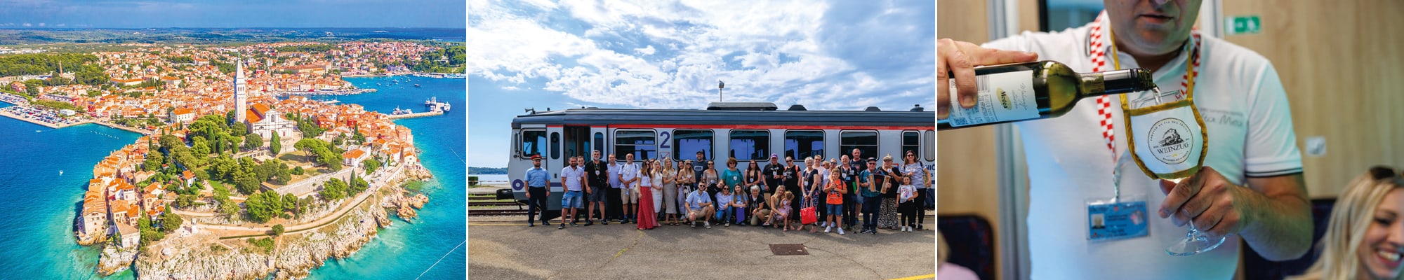 - Fahrt mit dem exklusiven Weinzug (Pula – Pazin) inkl. Weinverkostung (Malvazija, Teran & Sekt) und regionaler Spezialitäten (Pršut, Käse & Olivenöl)