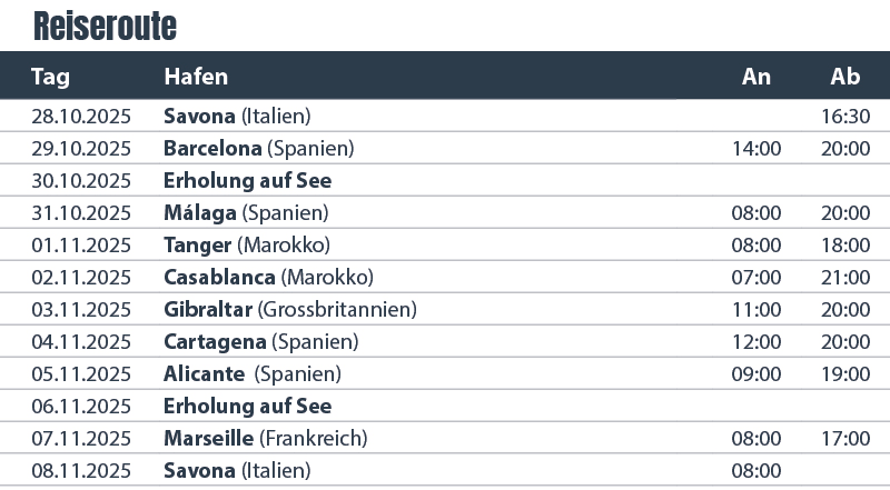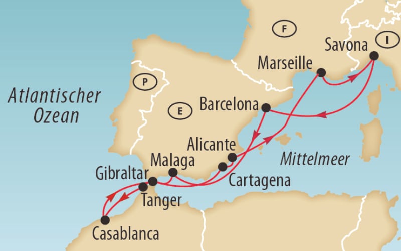 Unsere spezielle Route führt uns entlang der spanischen Küste nach Barcelona und Malaga. Mit Tanger und Casablanca besuchen wir gleich zwei der faszinierendsten Städte Marokkos. Dort lassen wir uns vom orientalischen Flair verzaubern und gehen auf Entdeckungstour durch die farbenfrohen Märkte. Wir geniessen herrliche Sonnentage an Bord und lassen es uns so richtig gut gehen. Zurück im Mittelmeer bummeln wir durch die spanischen Hafenstädte Cartagena und Alicante, bevor wir in Marseille dem Charme der Provence verfallen. Sichern Sie sich jetzt Ihre Plätze für diese fantastische Kreuzfahrt zum einmaligen Aktionspreis!