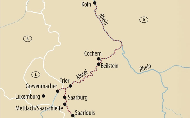 Charmante Altstädte, spektakuläre Flussschleifen, idyllische Weinorte: Auf dieser herrlichen Flussreise gleiten wir von der römischen Stadt Trier über die Mosel und Saar bis ins lebendige Köln. Dazwischen erwarten uns faszinierende Ausflüge in die Hauptstadt Luxemburg, zum Aussichtspunkt an der Saarschleife, in mittelalterliche Städtchen wie Cochem oder Beilstein – und natürlich feine Weine, die diese Region so berühmt machen.