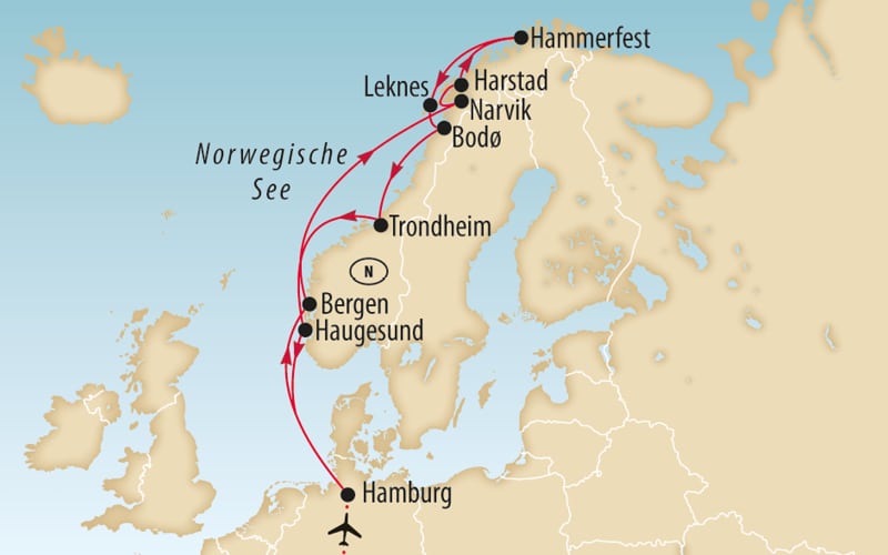Kommen Sie mit auf eine unvergessliche Reise ins Reich der nordischen Naturwunder. Hoch oben auf Deck eröffnet sich uns die raue Schönheit Norwegens: zerklüftete Schäreninseln, majestätische Fjorde und endlose Wälder ziehen lautlos vorüber. Bergen, Narvik, Harstad, Haugesund oder die faszinierenden Lofoten sorgen für jede Menge Abwechslung bei spannenden Landausflügen. Tagsüber erkunden wir einige der schönsten Küstenstädte Norwegens, und nachts lockt uns die Aussicht auf die Polarlichter aus unserer Kabine in die angenehme Stille der Dunkelheit. Lassen Sie sich von diesem farbenprächtigen Himmelsschauspiel verzaubern!