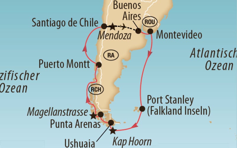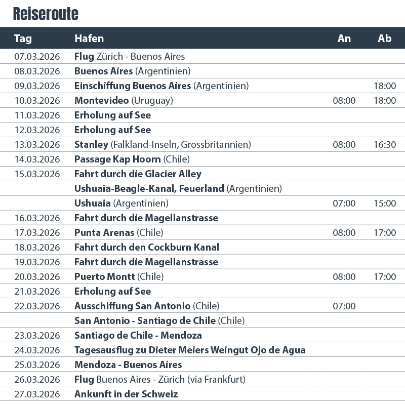 Verbringen Sie unvergessliche Tage an Bord der luxuriösen Oosterdam auf dieser legendären Südamerika-Route. Bestaunen Sie die vielfältige Tierwelt von Patagonien und Feuerland. Erleben Sie die Umfahrung des legendären Kap Hoorn am südlichen Ende der Welt und geniessen Sie die unberührten Landschaften der chilenischen Fjorde. Zum krönenden Abschluss fahren wir über die Anden ins Herz der Weinbaugebiete Argentiniens, wo wir das Weingut von Dieter Meier besuchen. Ein unvergessliches Erlebnis und ein Feuerwerk an Höhepunkten erwarten Sie!