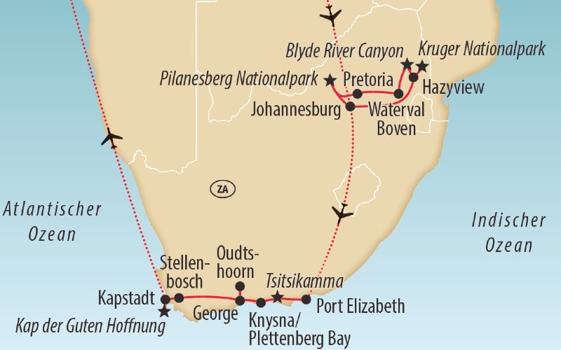 Eine Reise, so vielfältig wie das Land selbst: Wir begegnen den «Big Five» im offenen Geländewagen, bestaunen die legendären Cango-Höhlen, geniessen Zugnostalgie bei Rovos Rail und blicken vom Tafelberg über Kapstadt. Dazu charmante Lodges, kulinarische Highlights und bewegende Geschichten aus dem Herzen Afrikas. Diese Rundreise verbindet Natur, Kultur und Eisenbahnromantik zu einem Erlebnis, das bleibt.