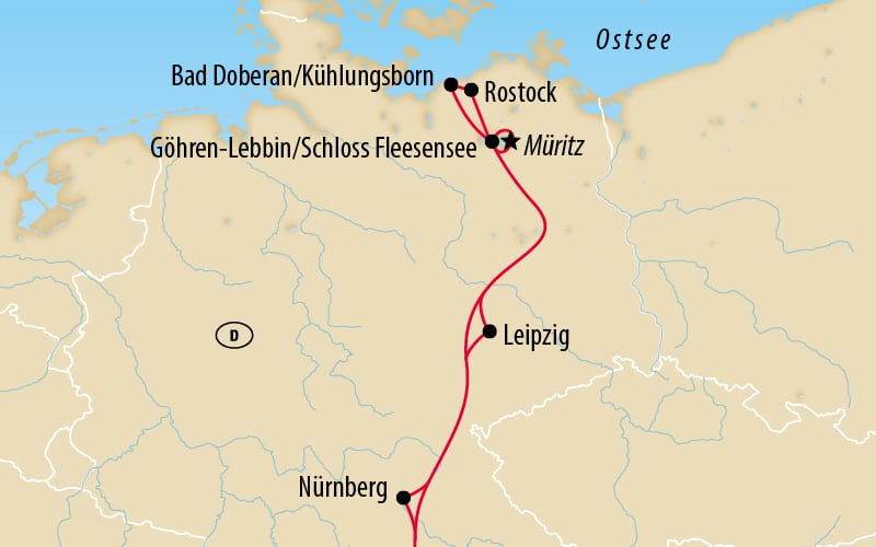 Diese Reise ist wie ein Sommermärchen aus dem Bilderbuch: Wir logieren in einem herrschaftlichen Schlosshotel inmitten der Mecklenburgischen Seenplatte, erleben bei einer Müritzrundfahrt das blaue Herz der Region, lassen uns an der frischen Ostseeluft den Wind um die Nase wehen und rollen mit der nostalgischen Bäderbahn Molli direkt bis Kühlungsborn. Dazu kommen die Musikstadt Leipzig, ein Abstecher nach Rostock und die Rückfahrt über Nürnberg – besser kann man den Sommer kaum geniessen!