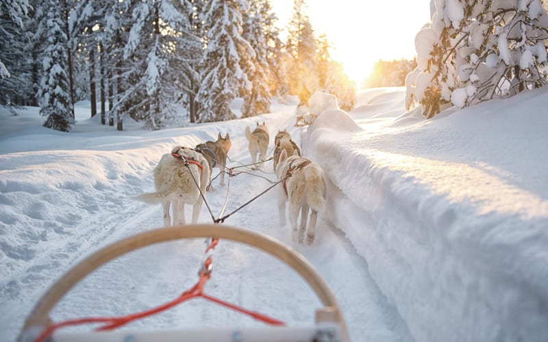 Ein Tag voller Emotionen: Auf der Huskyfarm begrüssen uns die temperamentvollen Schlittenhunde. Eingespannt in den Schlitten, gleiten wir durch unberührte Wälder– das einzige Geräusch ist das Hecheln der Hunde und das Knirschen des Schnees. Freiheit pur! Nachtessen im Hotel.